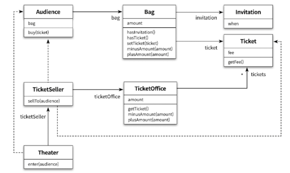 그리고 TicketSeller의 ticketOffice를 직접 호출해서 plusAmount 하는 부분도 수정해서 ticketOffice로 옮겨야 하는데 문제가 그러면 ticketOffice와 Audience 간에 의존성이 생김. 책에서는 자율성보다는 Audience자체에 대한 결합도를 낮추는 것이 더 중요하다 생각해서 그냥 기존대로 놔둠. 그니까 밑에 ticketSeller sellTo부분 그대로 놔둠