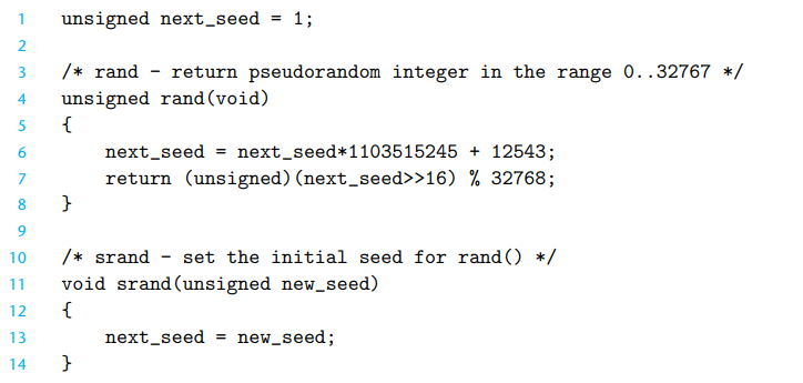 - 클래스 2: 다중 호출에 대해서 상태를 유지하는 함수들. rand함수는 스레드 위험인 함수인데 그 이유는 현재 호출의 결과가 이전 반복 실행으로부터의 중간 결과에 의존하기 때문이다. srand를 호출해서 seed값을 가져온 후 rand를 한 개의 스레드로부터 반복해서 호출할 때, 반복되는 숫자들의 배열을 기대할 수 있지만, 다수의 스레드가 rand를 호출하면 위험하다. rand 같은 함수를 스레드 안전하게 만드는 유일한 방법은 함수를 재작성해서 static 데이터를 전혀 사용하지 않도록 하는 것이다. 이를 위해서는 호출자의 상태 정보를 인자들로 전달해야 한다.