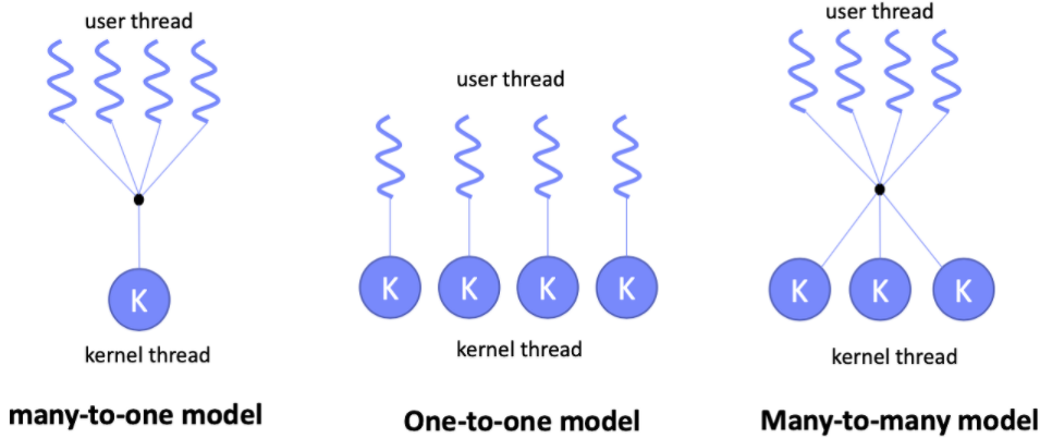 many-to-one model 은 요즘 잘 안쓰인다고한다 최근 운영체제들은 one-to-one model을 사용