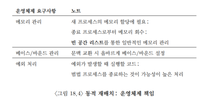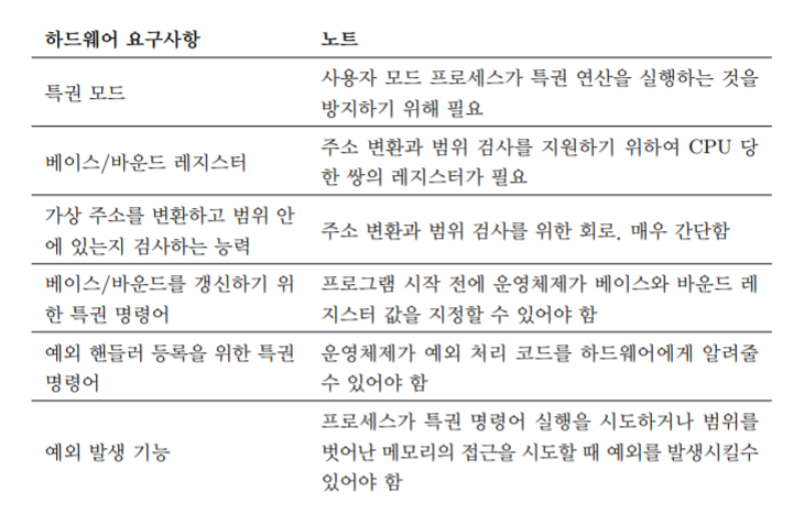 하드웨어는 바운드 베이스 레지스터 변경 명령어 제공해야 한다. 이 명령은 커널 모드에서만 동작해야 한다. 또한 cpu는 바운드 주소를 벗어난 메모리 접근이 일어나면 예외를 발생시킴. 다음은 운영체제 책임을 보자