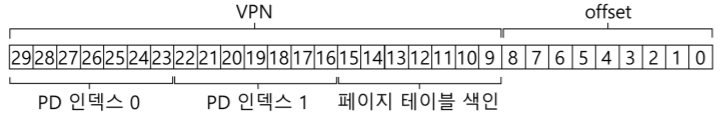다음으로는 페이지 테이블을 2단계 이상 사용하는 경우를 보자 예제에서는 512바이트 페이지와 30비트 가상 주소 공간을 가정한다. 페이지 크기가 512바이트이고 PTE크기가 4 바이트면 한 페이지에 128개의 PTE를 넣을 수 있다. 페이지 디렉터리를 위해서 14개의 비트가 남는다. 128 페이지의 연속된 메모리가 필요하게 되니 다시 나눈다. 7개의 비트들로 나눠서 작성한다.