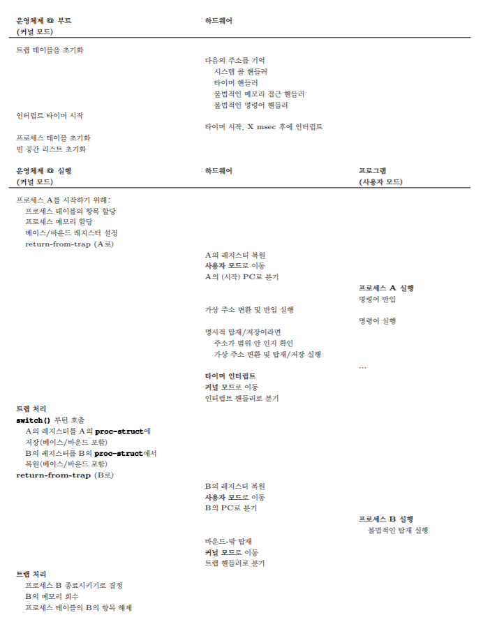 첫째로 운영체제는 주소 공간이 저장될 메모리 공간을 찾아야 한다. 둘째로는 프로세스가 어떻게든 종료가 되면 메모리를 회수해야 한다. 셋째로 프로세스 전환 시 pcb에 레지스터를 저장하고 복원해야 하고 , 넷째로 핸들러 함수들을 부팅할 때 로드에서 하드웨어가 알게 해줘야 함.