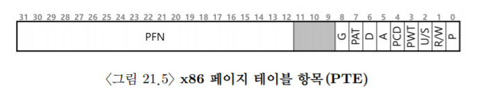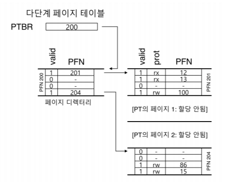 페이지 디렉터리에 유효한 페이지가 2개 있고 이 페이지들은 메모리에 존재한다. 페이지 디렉터리의 항목들은 테이블의 한 페이지를 나타낸다. PDE의 구성은 유효 비트와 PFN으로 구성된다. 페이지가 유효하다는 것은 이 페이지 내에 페이지들 중 최소한 하나가 유효하다는 것을 의미한다. 즉, PDE가 가리키고 있는 페이지 내의 최소한 하나의 PTE의 valid bit가 1로 설정됨. 멀티 레벨 페이지 테이블의 장점은 사용된 주소 공간의 크기에 비례하여 페이지 테이블 공간을 할당함. 다른 장점으로 페이지 테이블을 페이지 크기로 분할함으로써 메모리 관리가 매우 용이하다. 페이지 테이블을 할당하거나 확장할 때 운영체제는 free페이지 풀에 있는 빈 페이지를 가져다 쓰면 됨. 기존 선형 페이지 테이블은 크기가 클 경우 연속된 빈 물리 메모리를 찾는 것이 쉽지 않다. 한 가지 유의 사항은 멀티 레벨 페이지는 시간면에서 손해를 볼 수밖에 없다. TLB 미스 시 주소 변환을 위해 두 번의 메모리 로드가 발생. 또 다른 단점으로는 복잡도다.