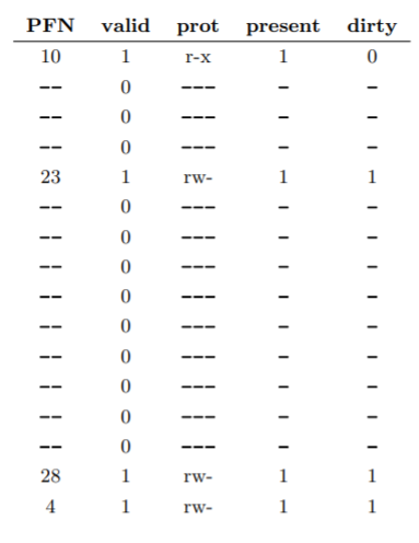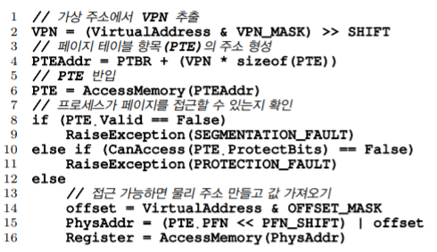 운영체제는 거의 모든 공간 관리 문제 해결할 때 두 가지 중 하나를 사용하는데 하나가 우리가 앞서 보았던 세그멘테이션이고 이건 가변 크기의 조각들로 분할함 근데 문제가 외부 단편화가 생기기 쉬움 그래서 여기서는 페이징이라고 동일한 크기의 조각으로 분할하는 것을 생각. 페이징의 장점은 유연성이다. 프로세스 주소 공간 사용 방식과는 상관없이 효율적으로 주소 공간 개념을 지원함. 힙과 스택이 어느 방향으로 커지는지 중요하지 않음 또 다른 장점은 단순함이다. 예를 들어 4개의 페이지를 물리 메모리 프레임에 배치하기 원하면 그냥 빈 공간 리스트에서 네 개의 페이지를 선택하면 됨 주소 공간의 각 가상 페이지에 대한 물리 메모리 위치 기록을 위하여 운영체제는 프로세스마다 페이지 테이블이라는 자료 구조를 유지함// 페이지 테이블의 주요 역할은 가상 페이지의 주소 변환임 가상 주소가 어떻게 물리 페이지로 변환되는지 보자 예를 들어 64바이트 주소 공간에서 페이지 크기가 16 바이트면 4개의 페이지가 가능하니까 2비트로 표현이 가능함 따라서 2비트 vpn을 가짐 나머지 4비트는 오프셋 vpn으로 페이지 테이블에서 페이지 테이블 엔트리 고르고 거기서 PFN을 찾아서 offset을 붙여서 만들어 준다. 여기서 한번 질문해보자 페이지 테이블은 어디에 저장되고 크기가 얼마이고 느리게 만들지 않을까?? 먼저 페이지 테이블은 위의 이론상 4KB를 가지면 변환 주소가 2^20이라는 걸 알 수 있다. 페이지 테이블 항목마다 4바이트 가지면 4MB 메모리가 필요하게 됨. 이게 또 프로세스가 100이라 그러면 400MB나 된다. 따라서 MMU에 있을 수는 없고 지금은 물리 메모리에 있다고 가정 나중에 보면 운영체제 가상 메모리에 존재할 수도 있고 디스크에 스왑 될 수도 있다. 자 그럼 페이지 테이블에는 실제 무엇이 있는가 아까 잠깐 이야기했지만, 페이지 테이블은 vpn을 통해서 pte에서 맞는 PFN을 찾게 함 여기서 valid bit라는 비트가 있는데, 프로그램이 실행을 시작할 때 코드와 힙이 주소 공간의 한쪽에 있고 반대쪽은 스택이 차지하고 있을 것이다. 그 사이의 모든 공간을 무효로 표시하고 이 메모리에 접근하려 하면 트랩을 발생시킴. 즉 할당되지 않은 주소 공간을 표현하기 위해 반드시 필요. 미사용 페이지를 모두 표시함으로써 이러한 페이지들이 물리 프레임을 할당할 필요를 없앤다. 또 페이지가 읽을 수 있는지 쓸 수 있는지 실행될 수 있는지를 표시하는 protection bit가 있다. present bit은 이 페이지가 물리 메모리에 있는지 혹은 디스크에 있는지 가리킨다. 이런 기본적인 기법들은 나중에 물리 메모리보다 더 큰 주소 공간을 지원하기 위해 주소 공간의 일부를 스왑 하는 방법에 대해 자세히 이야기함. dirty bit은 변경되었는지 여부를 나타냄. reference bit은 때때로 페이지가 접근되었는지를 추적하기 위해 사용. 이 정보는 페이지 교체 때 자세히 다룸.