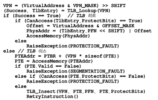 자 주소 변환 속도를 그럼 어떻게 빠르게 할 수 있을까?? 여기 TLB라는 하드웨어가 나온다. 아무튼 운영체제에서 개선이 필요하면 일단 하드웨어도 생각해 봐야 한다. TLB는 MMU의 일부다. 주소 변환 캐시라 보면 됨. 간략하게 설명하면 가상 메모리 참조 시. 하드웨어는 먼저 TLB에 원하는 변환 정보가 있는지를 확인함. 만약 있다면 페이지 테이블을 가지 않고 변환을 바로 실행. 이 방법 덕분에 페이징이 진짜 사용 가능하게 됨.