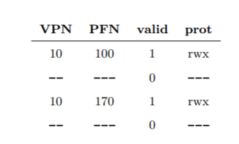 다음과 같이 TLB가 되어있다 10번째 가상 페이지가 두 프로세스에서 다르게 매핑되어 있는 것이다. 하지만 TLB는 그걸 모른다. 그럼 바로 해결해 보자. 위에서 말한 valid bit를 0으로 해서 비워주는 방식이 있다 근데 이건 문맥 교환 때마다 해주면 프로세스 바뀔 때마다 갱신해줘야 함. 다른 방법으로는 주소 공간 식별자라는 ASID 필드를 추가해 무슨 프로세스 인지 알 수 있게 해 준다. 위와 다르게 다른 가상 페이지가 같은 물리 프레임을 가리킨다 하면 이건 하나의 페이지에 두 프로세스가 공유하고 있다는 것을 알 수 있다. 이게 바이너리든 공유 라이브러리든 물리 페이지 수를 줄일 수 있기 때문에 굉장히 유용함. 자 그럼 TLB는 어떤 식으로 교체하는지 알아보자. 간단히 설명하면 LRU를 대표적으로 들 수 있다. 이름과 같이 최근까지 가장 사용이 덜 된 페이지를 내보내는 것이다. 하지만 이 방식은 교수님 수업에서 말한 것처럼 실제로 구현하기에 매우 까다로워서 pu와 마찬가지로 memory에서도 가상화 비슷한 전략을 추구한다. 제어와 효율성을 추구함. 프로그램을 다른 프로그램으로부터 보호하고 운영체제를 프로그램으로부터 보호하려면 하드웨어 도움이 필요함. 밑의 핵심문제를 보자