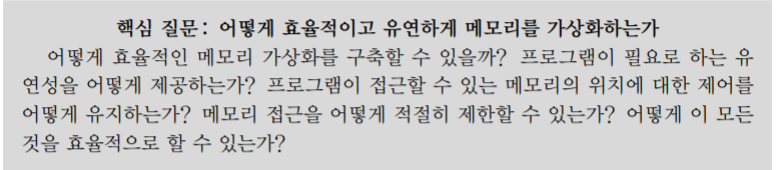 이 장에서는 모든 메모리 관리 시스템의 근본적인 측면을 논의함, 여기서 메모리 관리 시스템이란 힙의 페이지를 관리하는 malloc일 수도 있고 프로세스의 주소 공간의 일부분을 관리하는 운영체제 자체 일 수도 있다. 구체적으로 빈 공간 관리에 관련된 문제를 논의할 것이다. 빈 공간 관리가 어려운 경우는 관리하는 공간이 가변-크기 빈 공간들의 집합으로 구성되어 있는 경우이다. 이 경우는 malloc과 free에서 처럼 사용자 수준 메모리-할당 라이브러리에서, 그리고 세그멘테이션으로 물리 메모리를 관리하는 운영체제에서 발생한다. 어느 경우에도 외부 단편화 존재 여기서는 사용자 수준 메모리 할당 라이브러리에 존재하는 메모리 할당기에 초점을 맞출 것이다. 이 라이브러리가 관리하는 공간은 힙으로 불리며 힙의 빈 공간을 관리하는 데는 연결 리스트가 일반적으로 사용. 반드시 리스트일 필요는 없음. 또한 우리는 외부 단편화를 중점으로 이야기하겠다. 우리는 또한 클라이언트에게 할당된 메모리는 다른 위치로 재배치될 수 없다고 가정. free 하기 전까지. 단편화 해결을 위한 빈 공간 압축은 이경우에 사용 불가. 운영체제가 세그먼트를 위한 단편화 해결하기 위해서는 쓸 수 있음. 나중에 알아보고 이제 할당기에서 사용하는 일반적인 기법을 보자. 크게 2가지로 나뉜다 분할과 병합. 분할은 말 그대로 빈 공간 리스트에서 할당 요청이 들어오면 요청한 만큼만 주고 나머지는 다시 빈 공간 리스트에 있게 됨. 병합은 기존 사용되던 메모리 청크가 반납될 때 그 주변의 빈 공간 들과 합치는 것이다. 힙 영역에서 할당된 공간의 크기를 알기 위해서는 헤더라는 블록이 존재해야 됨 거기에는 사이즈와 안전성 검사를 위한 magic number가 있다. 또한 헤더는 사이즈를 제외하고 자기만의 크기가 있어야 됨. 따라서 우리는 할당해줄 때 헤더 크기까지 생각해야 됨. 힙의 확장도 생각해 봐야 하는데 시스템 콜인 sbrk를 요청함. 그럼 운영체제는 빈 물리 페이지를 찾아 프로세스 주소 공간에 매핑한 후, 새로운 힙의 마지막 주소를 반환. 기법에 대해 봤으니 진짜 할당을 어떻게 하는지 , 자세한 거는 직접 찾아보고 정책들 살펴보자 먼저 최적 적합 이건 가장 사이즈 맞는 것 중에 작은 거 찾음 그래서 무조건 빈 공간 리스트 다 돌아야 됨, 최악 적합은 그냥 무조건 큰 거 줌 이것도 전체 탐색함. 최초 적합은 처음 탐색하면서 만난 최조 중에 적합한 거 줌. 이거는 빈 공간 리스트 순서를 관리하는 게 중요함. next fit도 있는데 이건 그전에 찾았던 위치 다음부터 계속 진행해 나감. 또 다른 접근법으로는 개별 리스트가 있는데 특정 응용 프로그램에서 자주 요청하는 한 두 개 크기를 그 객체를 위한 별도의 리스트를 유지. 단편화를 확실히 줄여줌 근데 문제가 지정된 크기와 일반 메모리 풀 사이에 어떻게 메모리를 할당하는지가 의문. 그래서 나온 게 슬랩 할당기 이거는 커널 객체를 위한 객체 캐시를 이용함 여기서 말하는 객체는 우리가 아는 아이 노드, 락 등등. 객체 캐시는 지정된 크기의 객체들로 구성된 빈 공간 리스트임. 기존에 할당된 캐시 공간이 부족하면 상위 메모리 할당기에게 슬랩을 요청. 반대로 슬랩 내 객체들의 참조 횟수가 0이면 회수가 일어남. 슬랩은 빈 객체들을 사전에 초기화된 상태로 유지한다는 점에서 개별 리스트보다 우수함. 다음으로 버디 할당에 대해 알아보자 이건 빈 공간 리스트를 2^n인 하나의 크기에서 2씩 나눠서 계속 일정 크기의 2의 거듭제곱으로 만듦 버디 할당의 이점은 해제될 때 있다. 해제할 때 예를 들어 8KB 블록을 빈 공간 리스트에 반환하면 다른 8KB가 비어 있는지 확인하고 병합하여 16KB를 얻음 이렇게 계속 반복해서 다시 크게 만듦. 버디 할당이 잘 동작하는 이유는 특정 블록의 버디를 결정하는 것이 쉽다. 각 버디 쌍의 주소는 오직 한 비트만 다름. 앞에서 설명한 것들의 문제는 확장성임 리스트는 결국 개수가 늘어나면 순회 시간이 늘어남 따라서 다른 자료구조도 생각해볼 수 있음.