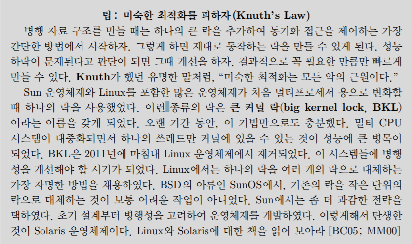 나머지 자료구조에서는 연결 리스트, 큐 ,해쉬 등이 있는데 각각 락을 전체적으로 놓을지 아니면 노드마다 놓을지 또는 헤드와 테일 각각 놓을지 등등 여러 방식으로 확장성을 증가 할 수 있다. 락을 많이 걸 수록 오버헤드가 증가해서 마냥 좋은게 아니다 그냥 하나 거는게 효율적으로 좋을 수도 있다.