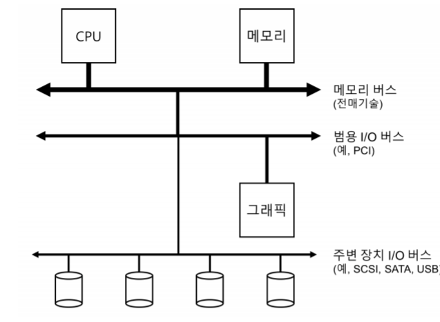 영속성 이야기 전에 입/출력 장치의 개념을 소개하고 운영체제가 이 장치들과 상호 작용하는 방법을 알아본다. 밑의 그림을 보면 CPU와 주메모리가 메모리 버스로 연결되어 있고, 몇 가지 장치들이 범용 I/O 버스에 연결이 되어 있다. 많은 현대 시스템에서는 PCI(많은 파생 버스)를 사용한다. 여기에 그래픽이나 다른 고성능 I/O 장치들이 연결되고 그 밑에 SCSI나 SATA 또는 USB 같은 주변장치용 버스가 있다. 여기서 디스크나 마우스 같은 느린 장치들이 연결된다, 가까울수록 고속화 버스를 사용하는데 여기에 고성능 장치들이 배치된다. 비용적인 문제 때문.