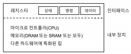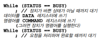 위에서 보인 그림에서 장치의 인터페이스는 3개의 레지스터로 구성된다. 상태는 장치의 현재 상태이고, 명령어 레지스터는 장치가 특정 동작을 수행하도록 요청할 때, 그리고 데이터는 장치에 데이터를 보내거나 받거나 할 때 사용됨. 이 레지스터들을 읽거나 쓰는 것을 통해 운영체제는 장치의 동작을 제어