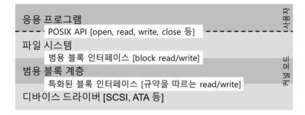 파일 시스템은 어떤 디스크 종류를 사용하는지 전혀 알지 못한다. 파일 시스템은 범용 블록 계층에 블럭 read/write 요청할 뿐이다. 범용 블럭 계층은 적절한 디바이스 드라이버로 받은 요청을 전달하며, 디바이스 드라이버는 특정 요청을 장치에 내리기 위해 필요한 일들을 처리. 캡슐화의 단점은 특수 기능을 많이 갖고 있는 어떤 장치가 있다고 했을 때, 커널이 범용적인 인터페이스만을 제공할 수밖에 없다면 특수 기능 사용 못한다. 흥미로운 것은 어떤 장치든 디바이스 드라이버 코드가 필요하기 때문에 운영체제 코드의 70% 이상이 디바이스 드라이버를 위한 코드이다.