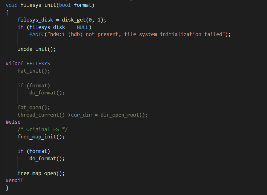 우리가 기존에 했던 방식은 비트맵을 사용하여 구현 하였다. 따라서 기존에 구현된 파일시스템 관련 하수들을 다 FAT 방식으로 바꿔야 한다. FAT은 연결리스트 형태로 구현하면 된다 .그전에 어디서부터 시작되나 보자. 시작은 일단 init.c에서 disk_init()과 filesys_init()에서 시작된다. filesys_init 들어가 보면 파일 시스템 모듈을 initialize 하는 곳이라고 나와있다.