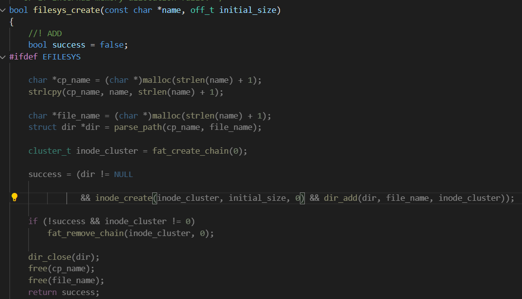 그리고 filesys.c 부분도 fat을 사용해서 구현해 주어야 한다. 또한 여기서 extensible 한 파일들을 만들기 위해 수정해줘야 한다. 파일이 늘어날때 chain에 추가해 주면된다 받은 파일명의 파일을 만들기 위해서는 일단 path를 알아야 하기 때문에 path parsing 하는 함수를 만들어 줘야한다.