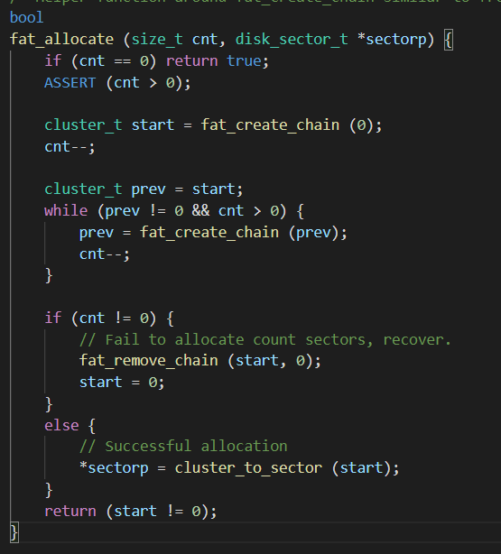 map_allocation대신에 fat_allocate를 작성해 주어야한다. 데이터 블록의 시작 섹터에 새로운 체인을 만들어서 연결시켜준다