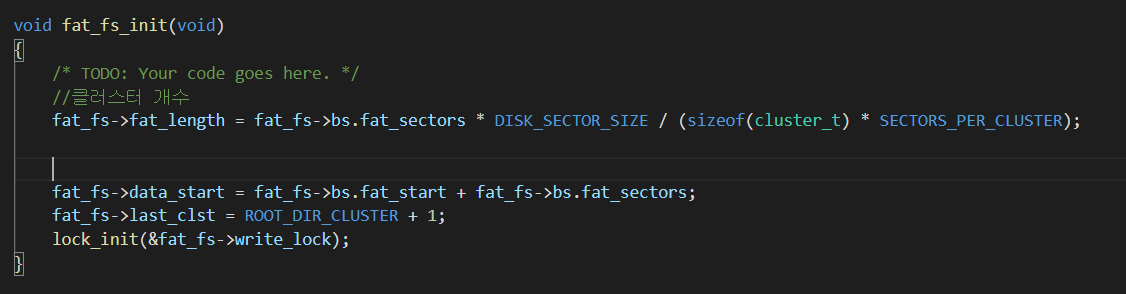 이제 구현해야할 fas_fs_init을 보자 깃북에는 'Initialize FAT file system. You have to initialize fat_length and data_start field of fat_fs. fat_length stores how many clusters in the filesystem and data_start stores in which sector we can start to store files 라 나와있다' fat_length 에는 클러스터의 수와 data_start에는 데이터 블록 시작 지점을 정해 줘야 한다. 우리가 위에서 부트섹터를 받아왔으니 여기서 데이터를 가져와서 설정해 주면 된다.
